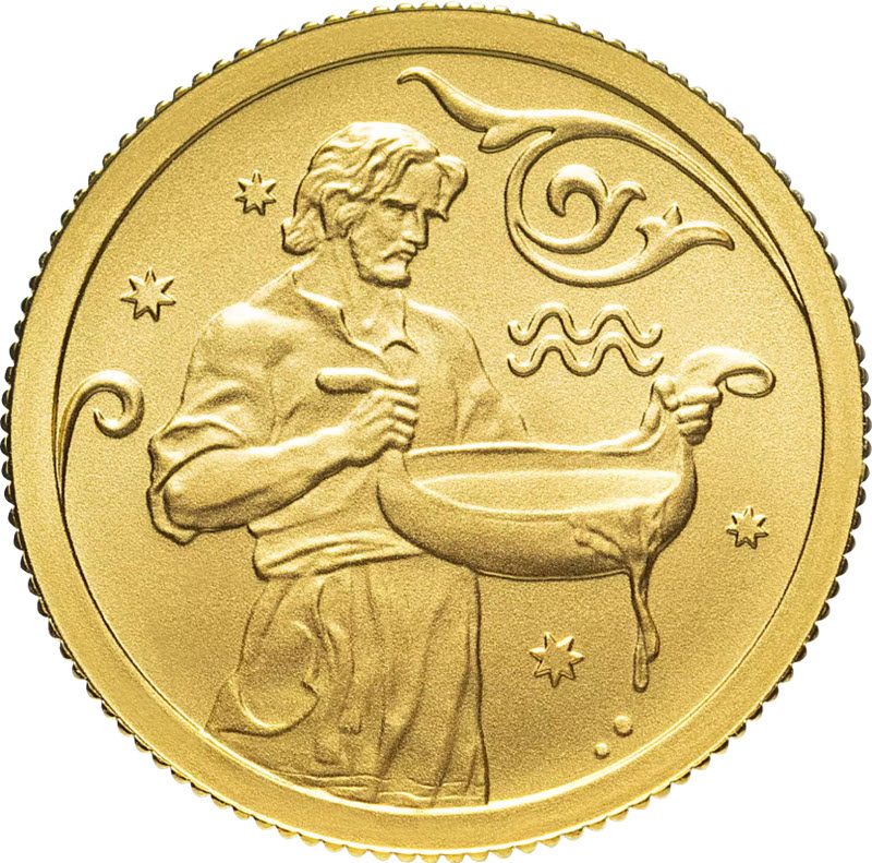 Золотая монета России «Знаки Зодиака - Водолей» 2005 года выпуска. Созвездие Водолея содержит 160 звезд, видимых невооружённым глазом. Находится в Северном полушарии.