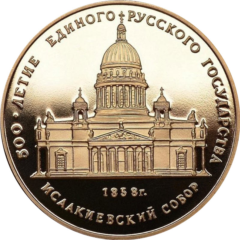 слева, сверху и справа вдоль канта монеты слова «500-ЛЕТИЕ ЕДИНОГО РУССКОГО ГОСУДАРСТВА», в середине Исаакиевский собор в Санкт-Петербурге, под ним год постройки собора «1858г.», внизу вдоль канта слова «ИСААКИЕВСКИЙ СОБОР».